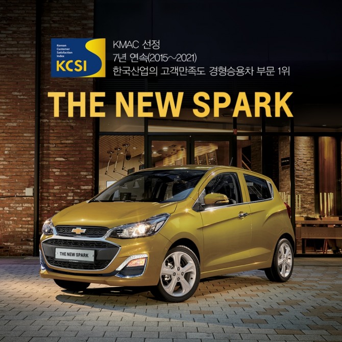 한국지엠 쉐보레가 내놓은 '더 뉴 스파크'가 ‘2021년 한국산업 고객만족도조사’ 경차 부문에서 1위를 차지했다.
