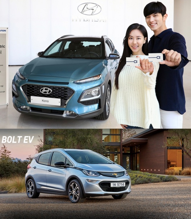 이미지 확대보기현대차 코나 일렉트릭(위)과 쉐보레 볼트 EV가 국내 전기차 시장 흥행에 앞장서고 있다. 쉐보레 볼트EV 5000대가 3시간 만에 완판된데 이어 현대자동차 오는 4월 선보이는 코나 일렉트릭도 사실상 완판됐다.