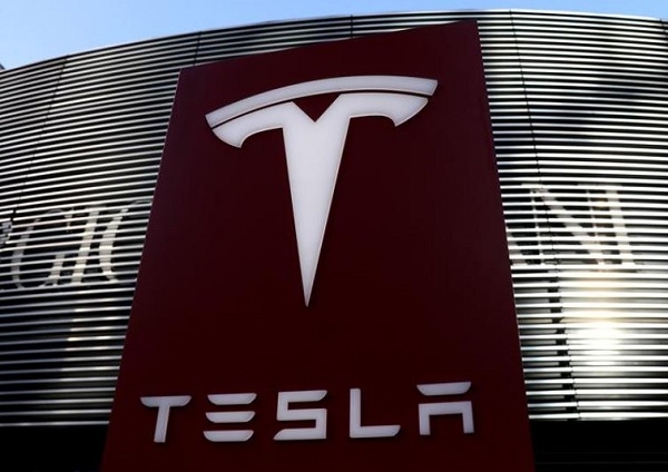 중국 베이징의 건물에 테슬라 로고가 새겨진 현수막이 걸려있는 모습. 사진=로이터