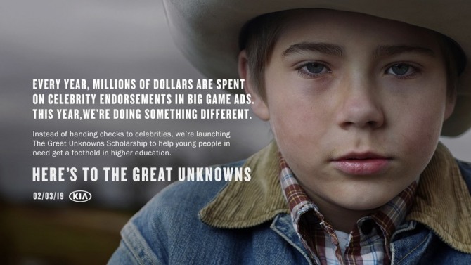 기아차는 "슈퍼 볼 LIII에 많은 유명 기업과 인사들이 수백만 달러의 돈을 지원할 것이다. 그러나 그 돈이 다르게 쓰일 수 있다면 어떨까?"라는 질문을 던지면서 기아자동차의 장학지원 프로그램인 '위대한 익명의 장학금(Great Unknowns Programs)'을 광고로 내보낸다. 특히 기아차가 올 상반기에 미국 시장에서 전략차종으로 내놓을 SUV '텔루라이드'를 광고할 것이라는 예상을 깬 파격 광고라는 게 자동차 전문가들의 평가다.