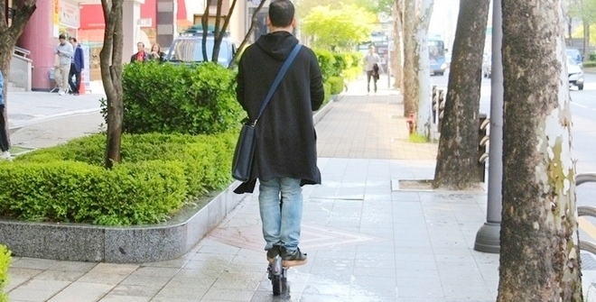 이미지 확대보기남성이 전동킥보드를 타고 인도를 달리고 이다. 전동킥보드는 차도 오른편으로 주행해야 한다.아울러 전동킥보드 운행 시에는 반드시 헬멧을 착용해야 한다.