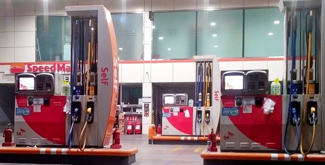 이미지 확대보기J주유소에서 2.5㎞ 떨어진 SK셀프 A주유소에는 24시간 직원이 상주한다. 왼쪽 주유기 중간 오른쪽에 모자를 쓴 직원이 보인다.