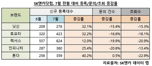 SK엔카 직영 중고차 플랫폼 SK엔카닷컴(대표 김상범)은 7월 SK엔카닷컴에 등록된 5개 일본 브랜드 차량의 등록 대수, 문의 건수, 조회수를 조사한 결과 전월 대비 매물은 늘고 문의 건수와 조회수는 감소했다고 8일 밝혔다.
