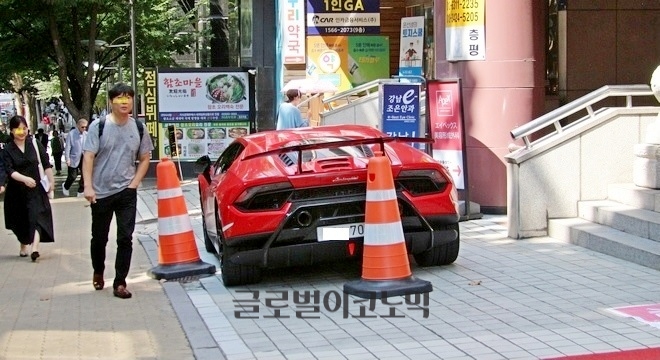 서울 강남 테헤란로 지하철 2호선 역삼역 구간 인도 옆에 람보르기니 우라칸 퍼포만테 한대가 주차돼 있다. 행인의 접근을 차단하기 위한 고깔을 차량 뒤와 옆에 가진 채.