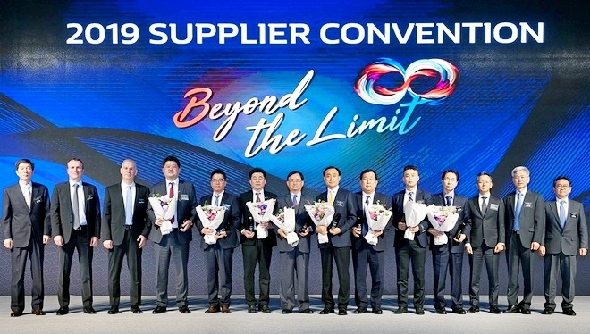 르노삼성이 추석을 맞아 중소 부품협력사에 물품대금 91억원을 조기 지급한다. 3월 열린 르노삼성 협력업체 컨벤션에서 올해의 협력사로 선정된 기업 대표 대표들이 기념 사진을 찍고 있다. 사진=르노삼성