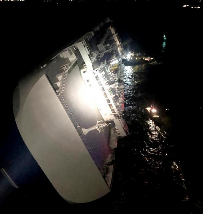 이미지 확대보기 현대글로비스 자동차 운반선(PCC) 골든레이호가 전도됐다. 사진=미국 해안경비대