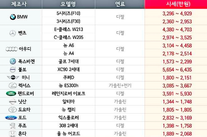 수입차 인기 모델인 BMW 3시리즈는 최소가가 2.4% 떨어져 2300만원대에 구매가 가능하고, 벤츠 C-클래스는 전달 3000만원대에서 이달 2900만원대에서 구매 가능하다. 닛산 알티마는 최소가가 3.1% 떨어졌다.