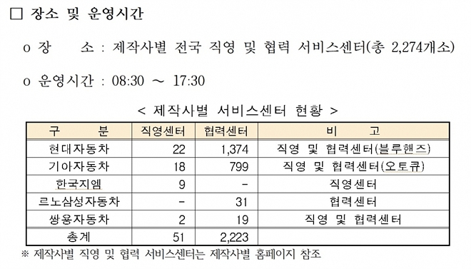 17일 한국자동차산업협회에 따르면 5개사는 각각의 전국 직영·협력 서비스센터(총 2274개소)에서 사전 예방점검 서비스를 오전 8시 30분부터 오후 5시 30분까지 실시키로 했다.