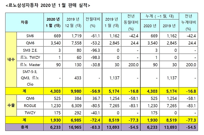 이미지 확대보기르노삼성차 2020년 1월 판매 실적. 사진=르노삼성차 르노삼성자동차가 지난 1월 판매 부진으로 고전하고 있는 가운데 QM6 만이 약세를 보이며 효자 역할을 톡톡히 해내고 있다.