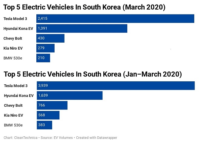 1분(1~3월)기 누적 판매량은 테슬라 모델3 3939대, 현대 코나 EV 1639대, 쉐보레 볼트 EV 766대, 기아 니로 EV 568대, BMW 530e 383대로 나타났다.