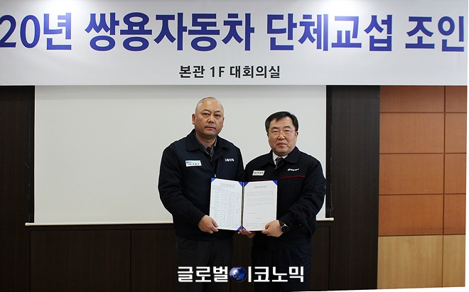 쌍용차는 지난 17일 경기도 평택공장에서 예병태 대표이사와 정일권 노동조합 위원장 등 노사 관계자가 참석한 가운데 2020년 임금 및 단체교섭 조인식을 열고 올해 임금 동결 등의 내용에 최종 합의했다고 20일 밝혔다.