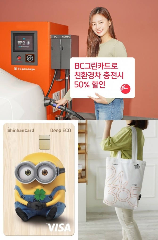 이미지 확대보기카드사들도 ESG 경영의 일환으로 전기차·수소차 충전요금 할인, 에코백 판매, 나무 소재 플레이트의 친환경 카드 출시 등 친환경 움직임에 앞장서고 있다. 사진=BC카드, 삼성카드, 신한카드