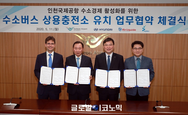 현대차는 지난 11일 인천국제공항공사에서 구본환 인천국제공항공사 사장, 기욤 코테 에어리퀴드 코리아 대표이사 사장, 유종수 수소에너지네트워크 대표, 한성권 현대차 상용사업담당 사장 등 사업 관계자가 모인 가운데 수소전기버스 충전소 유치를 위한 업무협약을 체결했다고 12일 밝혔다.