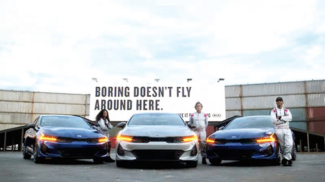 4일 자동차 외신 전문지 오토루에 따르면 기아차 미국 판매법인이 전문 스턴트 드라이버들과 함께 K5 세대로 레이싱 트랙에서 '트리플 스렛 스턴트(Triple Threat Stunt)'를 선보였다.