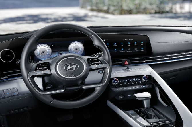 이미지 확대보기올해 초 출시된 현대자동차 '올 뉴 아반떼(CN7)'에 탑재된 디지털 계기판과 10.25인치 인포테인먼트 시스템. 사진=현대차