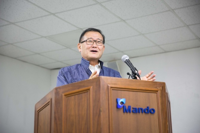 이미지 확대보기정몽원(65) 한라그룹 회장이 지난 2018년 9월 경기 평택시 만도 브레이크사업본부 제동2공장에서 기념식 축사를 진행하고 있다. 사진=한라그룹