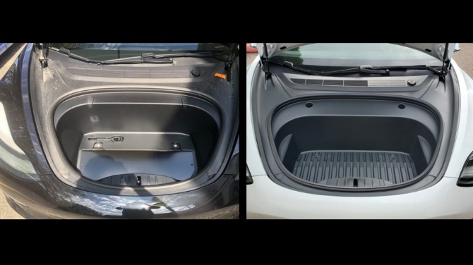 2018년식 테슬라 모델 3(왼쪽)와 2020년식 테슬라 모델 3의 프렁크 비교. 사진=일렉트렉