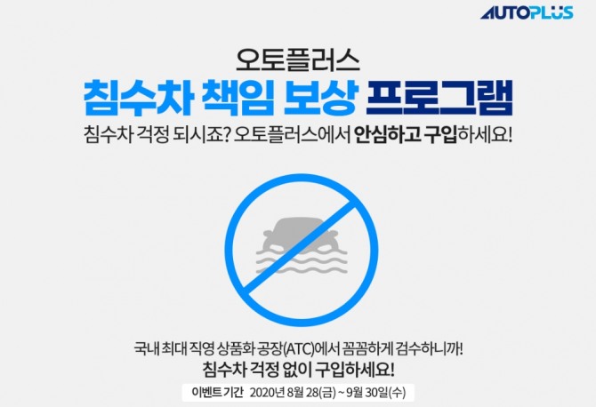 오토플러스는 28일 자사 직영 유통망을 통해 중고차를 구매한 소비자를 대상으로 ‘침수차 책임 보상 프로그램’을 오는 9월 30일까지 진행한다고 밝혔다.