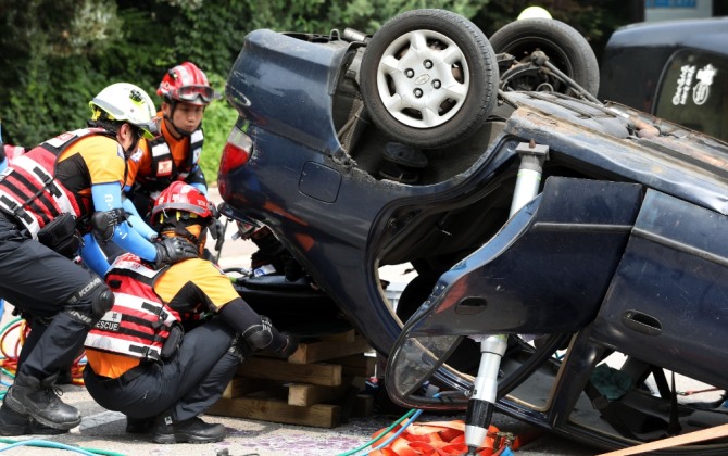 이미지 확대보기서울 광진소방서 소속 소방대원들이 지난해 7월 옛 동부지방법원에서 차량 전복 사고에 대비한 인명구조 훈련을 하고 있다. 사진=뉴시스