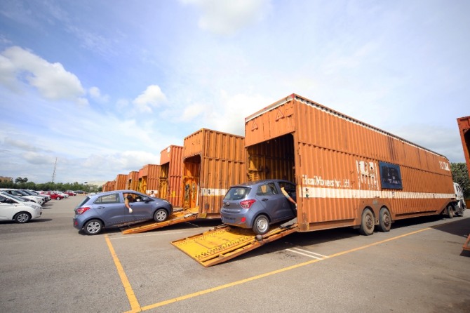 현대자동차 인도법인(HMIL)에서 생산된 소형차 'i20'이 인도 각지로 이동하기 위해 화물트럭에 싣고 있다. 현대차 인도법인은 최근 화물트럭 대신 철도 수송 비중을 10% 이상 늘린 것으로 전해졌다. 사진=현대차