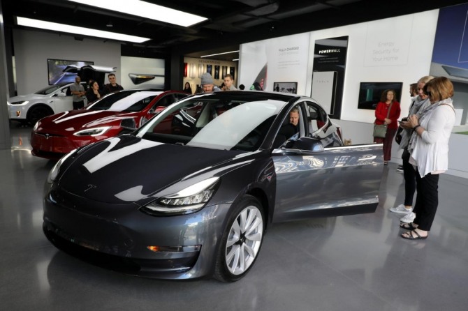 이미지 확대보기미국 로스앤젤레스의 테슬라 매장에서 손님들이 모델3를 살펴보고 있다. 사진=로이터
