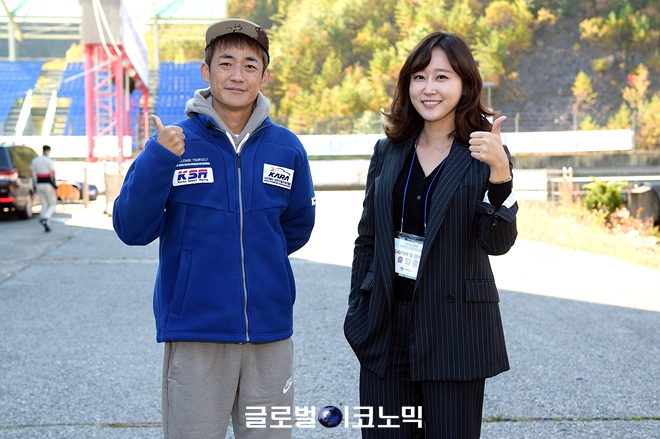 이미지 확대보기17일 개최된 넥센스피드레이싱 3라운드 경기의 중계 해설을 맡은 개그맨 한민관(왼쪽)과 아나운서 전지후가 포즈를 취하고 있다. 사진=글로벌이코노믹 김현수 기자 17일 강원도 태백스피드웨이(1랩=2.5km)에서 '2020 태백시장배 & 넥센타이어 스피드레이싱' 3라운드가 개최됐다.
