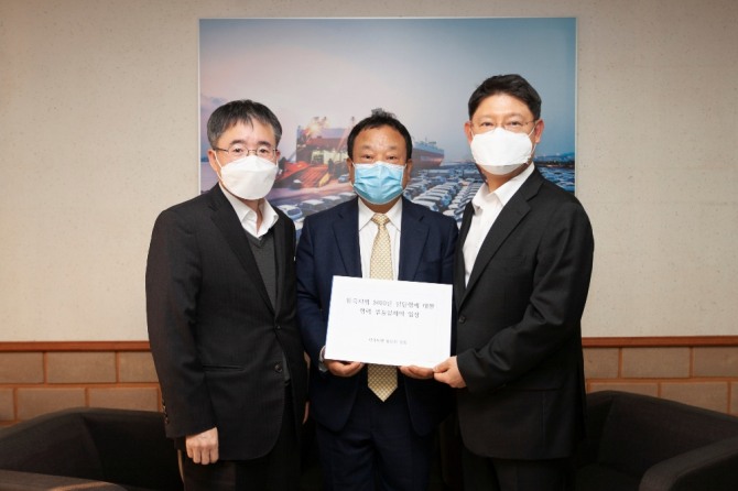 이미지 확대보기(왼쪽부터) 노철호 KM&I 대표, 문승 한국지엠 협신회 회장(다성 대표), 허우영 우신시스템 대표 등 한국지엠 부품 협력사 모임 '협신회' 관계자들이 28일 한국지엠 노사에 전달할 호소문을 들어 보이고 있다. 사진=한국지엠협신회 한국지엠 노사가 올해 임금·단체협상(임단협) 타결에 난항을 겪어 부품을 납품하는 협력사들이 줄도산 위기에 직면했다.