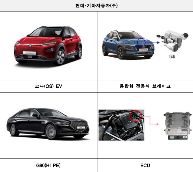 현대차 코나 일렉트릭과 코나 하이브리드, 넥쏘, 그리고 기아자동차 쏘울 전기차(EV) 등 4개 차종 5만 2759대는 전동식 브레이크 시스템 소프트웨어 결함으로 브레이크 경고등이 켜질 때 페달이 무거워져 제동이 제대로 되지 않을 가능성이 있는 것으로 확인됐다.