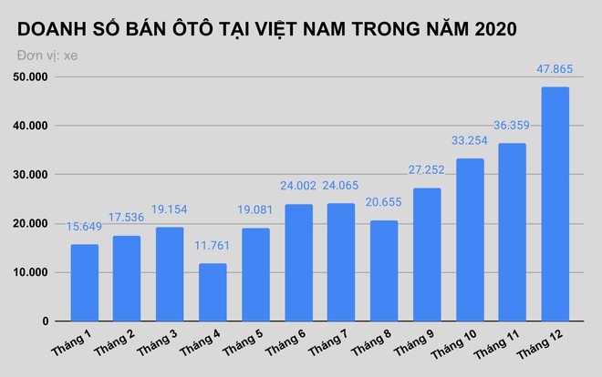 21일(현지시간) 베트남 현지매체 징(Zing)등에 따르면 베트남 자동차 제조협회(VAMA)는 최신 보고서를 통해 2020년 12월 전체 자동차 시장의 판매량은 4만7865대로 전월 대비 31.6%, 2019년 동기 대비 45% 증가한 것으로 나타났다고 밝혔다.