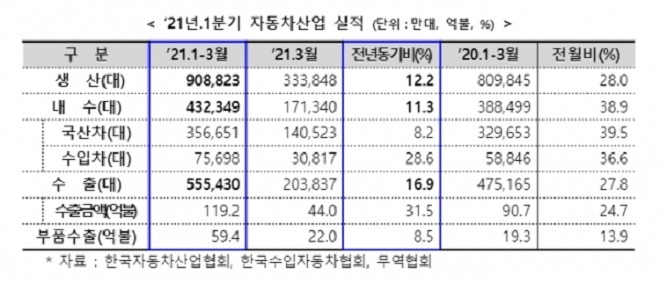 내수는 역대 1분기 중 최대인 43만2349대를 기록했다.