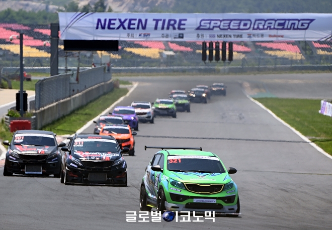 이미지 확대보기넥센스피드레이싱 2R RV-300 결승 경기 장면. 사진=글로벌이코노믹 김현수 기자결승은 롤링 스타트로 시작을 알렸다. 1랩 첫 코너에서는 충돌 없이 경기가 진행됐지만 이희태(TS 모터스)가 스타트법 위반으로 피트스루 페널티를 받았다.
