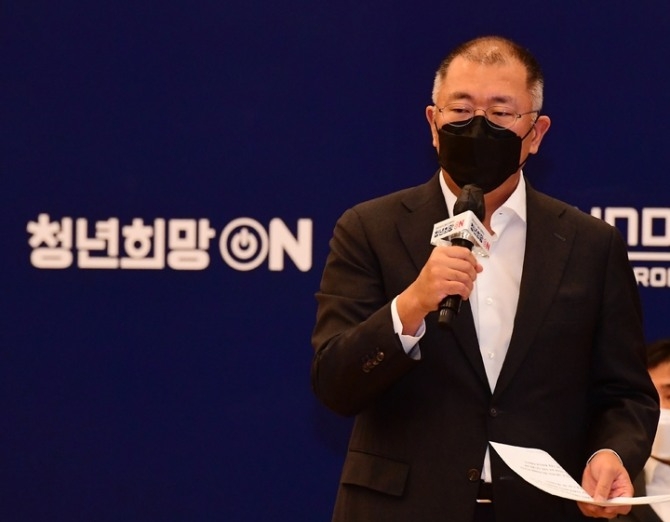 정의선 현대자동차그룹 회장이 22일 오전 경기 고양시 현대 모터스튜디오 고양에서 열린 청년희망ON 프로젝트 행사에 참석해 인사말을 하고 있다. 사진=뉴시스