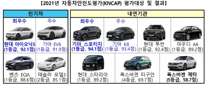 국토교통부는 한국교통안전공단 자동차안전연구원과 2021년 자동차안전도평가(KNCAP) 대상 11개 차종에 대해 평가한 결과 전기차 부문 1위는 현대 아이오닉5, 내연기관차 부문 1위는 기아 스포티지가 차지했다고 23일 밝혔다.