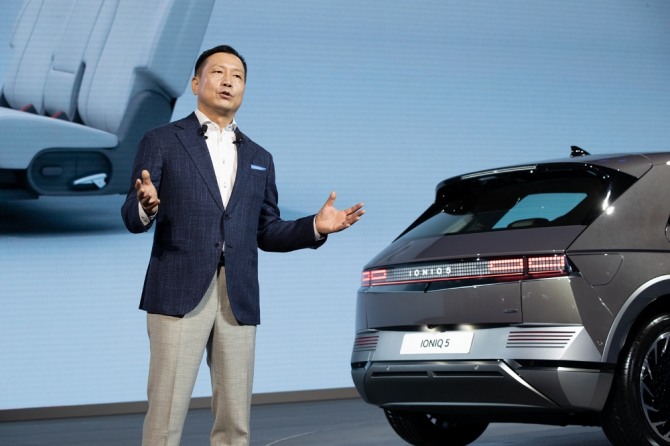 리홍펑 현대차·기아 브랜드 및 판매부문 총괄이 지난해 4월 상하이 국제 모터쇼에서 아이오닉 5를 소개하고 있다. 사진=현대차이미지 확대보기