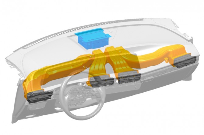 이미지 확대보기UV 광촉매 살균 방식의 내장형 공기살균기(파란색)와 항균 신소재(산화아연 등)를 적용한 에어덕트(노랑색) 모습. 사진=현대모비스