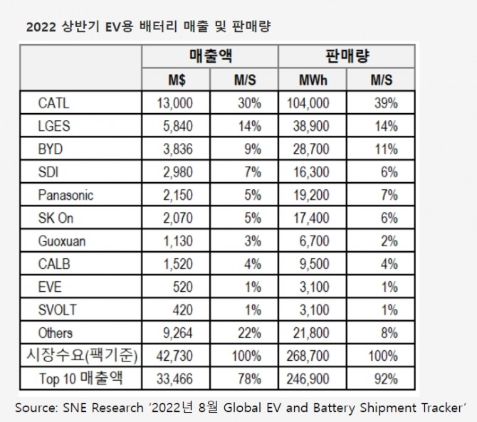반면, 중국은 CATL, BYD, 궈쉬안, CALB, EVE, SVOLT 등 6개 업체가 10위권에 들어가며 총매출액 189억600만달러(26조 297억)를 기록했다.