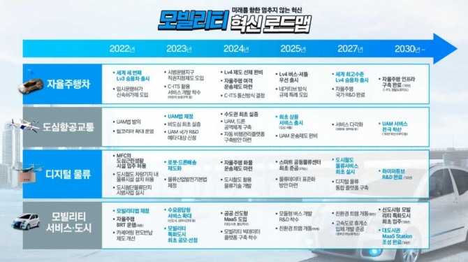 주어진 과제는 운전자가 필요 없는 완전자율주행 시대 개막, 교통 체증 걱정 없는 항공 모빌리티 구현, 스마트 물류 모빌리티로 맞춤형 배송체계 구축, 모빌리티 시대에 맞는 다양한 이동 서비스 확산 등이다.