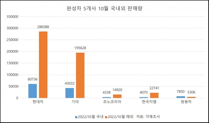 이는 지난 7월 이후 4개월 연속 판매량 증가다. 또 지난해부터 이어진 반도체 부품 수급 문제와 글로벌 경기 침에도 견조한 실적을 달성했다는 평가다. 반면 전월과 비교해서는 소폭 줄었다. 5개사의 9월 합산 판매량은 66만1725대로 10월 대비 2.4% 떨어졌다.