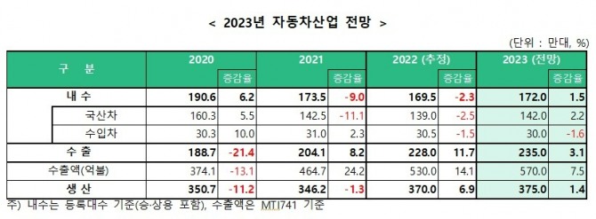 수출은 글로벌 경기침체, 미국 인플레이션 감축법(IRA)으로 인한 전기차 수출 차질, 러시아 수출 중단 등의 악재가 있지만, 국산차의 높은 상품성과 더불어 고환율 지속으로 가격경쟁력을 확보하며 3.1% 증가한 235만대로 예상된다. 생산은 견조한 국내외 수요를 바탕으로 각종 원자재 및 반도체 수급이 원활히 진행될 경우 1.4% 증가한 375만대를 기록할 것으로 보인다.