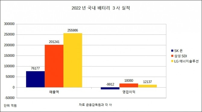 이날 실적이 공개된 SK온은 매출액 7조6177억원, 영업손실 9912억원을 기록했다. LG에너지솔루션, 삼성SDI와는 다르게 영업손실 폭이 확대됐다. 지난해 4분기에는 3분기 대비 1220억원 확대된 2566억원의 손실을 봤다. SK온은 2021년 6831억원, 지난해 1~3분기 각각 분기별로 2734억원, 3267억원, 1346억원의 영업손실을 기록했다.
