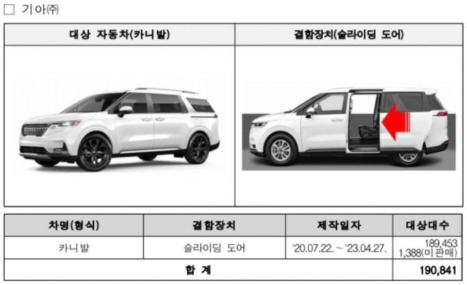국토교통부는 기아에서 제작·판매한 카니발 19만0841대에서 슬라이딩 도어가 닫히기 직전 신체 일부를 도어 사이에 넣는 등의 특정 상황 발생 시 안전 기능이 작동하지 않아 탑승자에게 상해를 입힐 수 있음이 발견돼 시정조치에 들어간다고 10일 밝혔다.