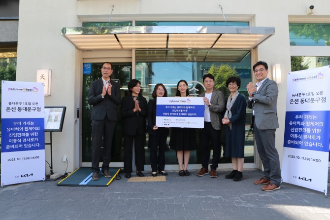 이미지 확대보기기아는 교통약자의 이동 편의 및 접근성 향상을 위해 전개하는 ‘웰컴휠(Welcome wheel) 캠페인’의 시작으로 텐동전문점 ‘온센’(동대문구 소재)을 1호점으로 선정했다. 11일 온센 앞 이동식 경사로 전달식에서 관계자 기념 촬영을 진행하고 있다 사진=기아