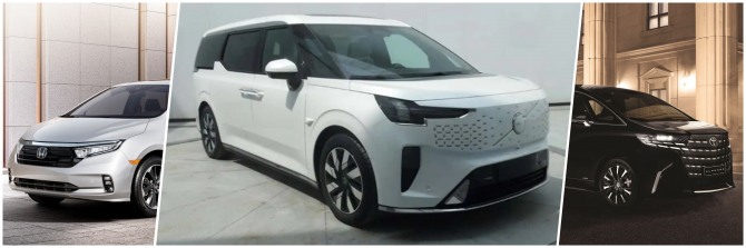이미지 확대보기(가운데)최근 중국 특허청을 통해 공개된 볼보 EM90, (왼쪽) 혼다 오딧세이, (오른쪽) 토요타 알파드 사진=중국 특허청, 각사