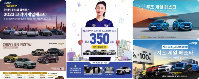 5일 업계에 따르면 11월 2023 코리아 세일 페스타를 맞아 완성차 기업들의 참여가 두드러졌다. 코리아 세일 페스타는 산업통상자원부가 후원하는 쇼핑 축제로 오는 11일부터 30일까지 진행되고 2400개 이상의 기업이 참여하면서 자동차 업계도 대목을 맞을 것으로 기대된다.