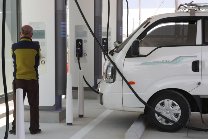한 전기차 운전자가 충전을 하고 있다. 사진=뉴시스
