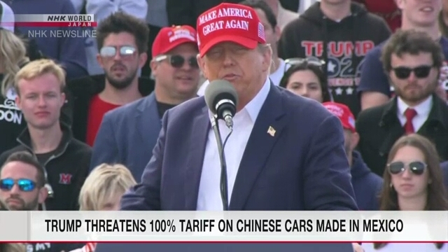이미지 확대보기트럼프 전 대통령이 오하이주 집회에서 연설하고 있다. 사진=NHK WORLD 캡처[글로벌모터즈 이정태 기자] 도널드 트럼프 전 미국 대통령이 중국 기업이 멕시코에서 만드는 자동차에 '100% 관세'를 부과하겠다고 강경 자세를 더욱 강화했다.