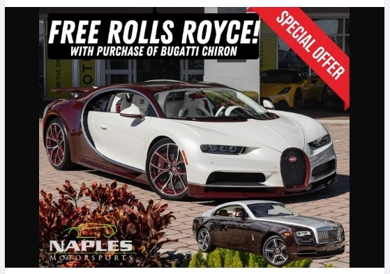 18일 업계에 따르면 지난 14일(현지시각) ‘네이플스 모터스포츠’ 중고차 플랫폼의 페이스북에 올라온 한 광고 포스트가 이슈를 만들어냈다. 플로리다의 한 딜러십이 현재 보유한 부가티 시론을 구매하는 사람에게 무료로 롤스로이스 레이스를 제공한다는 내용이다.