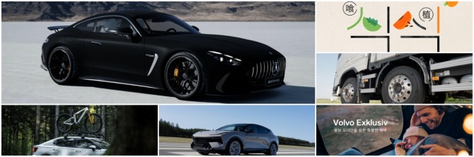 이미지 확대보기(좌측상단부터 시계방향) 메르세데스-AMG GT 55 4Matic+ 론치 에디션, 렉서스코리아가 진행하는 식(食)식(植)마켓 홍보 포스터, 미쉐린코리아가 볼보트럭 신차에 OE 타이어로 공급하는 'X 멀티 에너지' 타이어, 볼보자동차코리아가 진행하는 오너 대상 프리미엄 로열티 프로그램 ‘볼보 익스클루시브’ 홍보 포스터, 한국자동차전문기자협회가 선정한 2025 올해의 퍼포먼스카 로터스 엘레트라, 폴스타가 진행하는 국제 도로사이클 대회 '투르 드 경남 2025' 콜라보 홍보 포스터 사진=각사