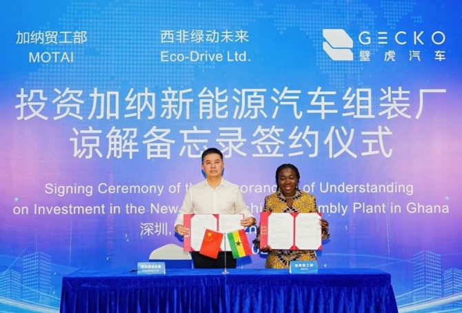 중국 선전 게코 신에너지 자동차 기술 유한회사(Gecko)가 아프리카 시장 진출을 본격화하며 가나에 전기차(NEV) 생산 거점을 마련한다. Gecko는 15일, 중국 선전에서 가나 통상농업산업부와 가나 내 NEV 조립 공장 설립을 위한 투자 양해각서(MOU)를 체결했다. 이번 협약은 중국 NEV 기업이 가나에 진출하는 첫 사례다.
