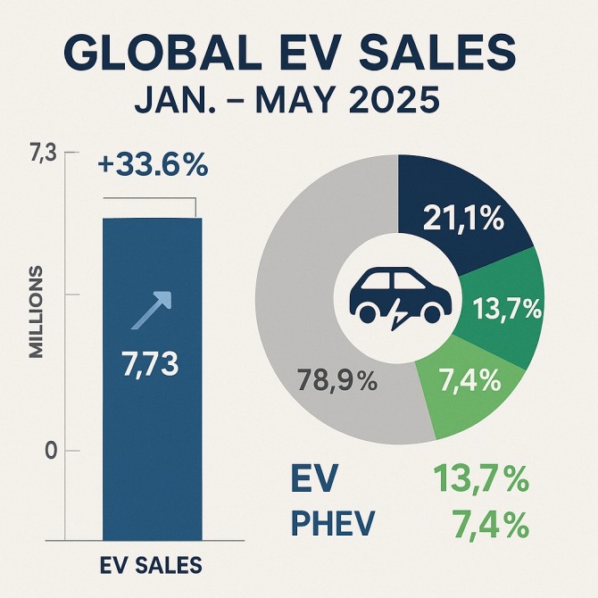 올해 들어 전 세계 신차 5대 중 1대가 전기동력차로 팔렸다. 한국자동차모빌리티산업협회(KAMA)가 1일 발표한 ‘2025년 1~5월 글로벌 전기동력차 시장현황’ 보고서에 따르면, 이 기간 전 세계에서 전기동력차(BEV, PHEV, FCEV 포함)는 전년 동기 대비 33.6% 증가한 773만 대가 판매되며, 전체 신차 시장의 21.1%를 차지했다.